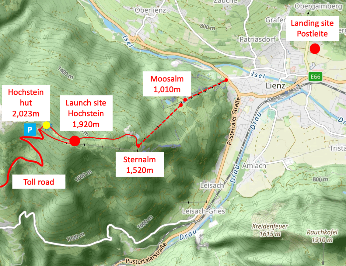 Access via the Hochstein road: This toll road leads from Bannberg to just below the Hochstein Hut. From the parking lot at the end of the road, the launch site can be reached directly via a forest track in about 15 minutes; however, the detour via the Hochstein Hut is worthwhile for its magnificent panoramic views and culinary offerings. The road is open from May to October; during the winter months, the launch site can only be reached via a longer hike from Bannberg or Lienz.