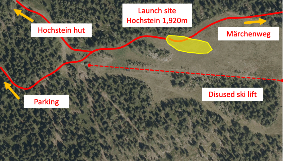 Hike from Sternalm: When the Hochstein lifts are in operation (summer season only), you can reach the launch site from the chairlift top station at Sternalm in a hike of approximately 1½ hours via the "Märchensteig" (ca. 400 meters elevation difference)