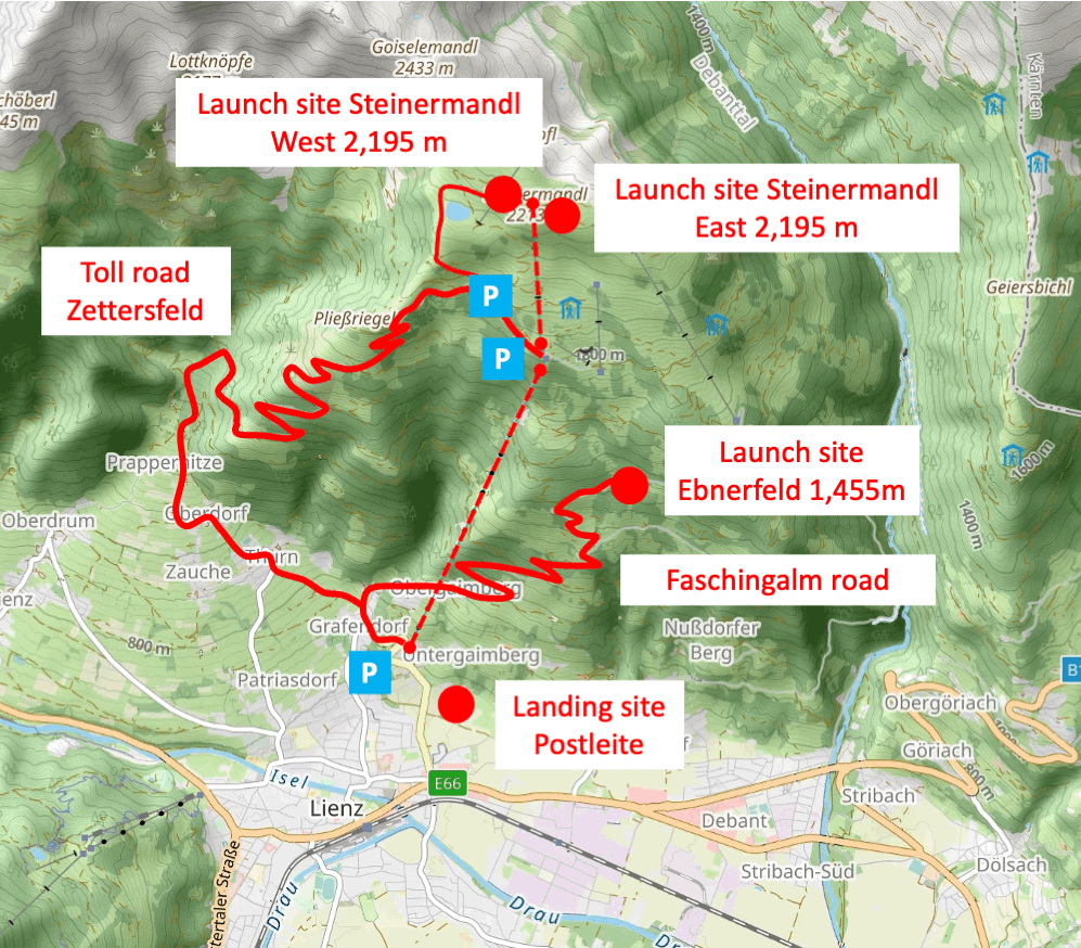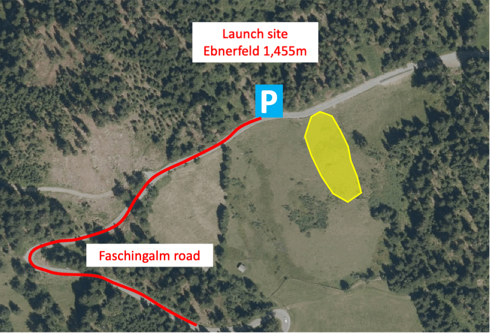 The launch site is located on the road from Lienz via Gaimberg to the Faschingalm. Cars can be parked directly next to the site on the roadside. Those without car can hike up from the Postleite landing site in about 1.5 to 2 hours.