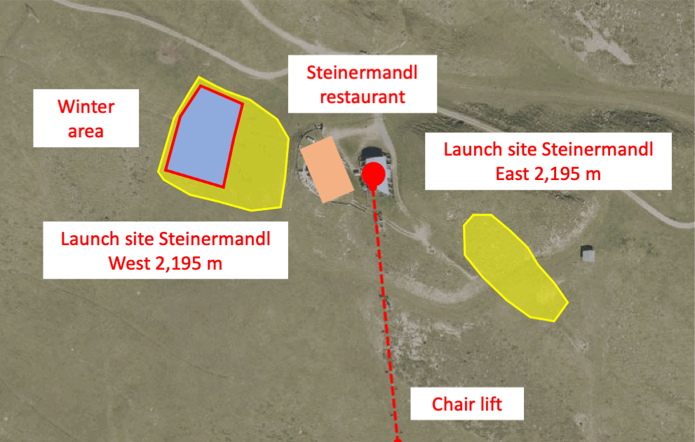 No start on the ski slope in the winter season: During the lift operation, a separate launch field is prepared for us at the Steinermandl West launch site.